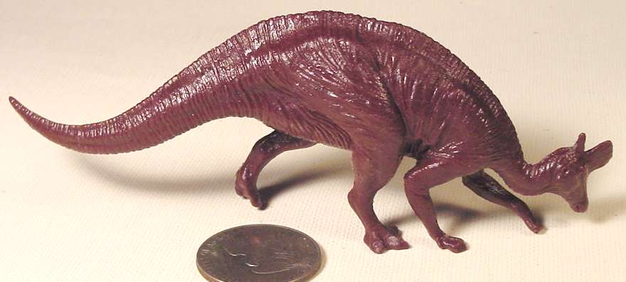 The family Hadrosauridae comprise the duck-billed dinosaurs. All the duck-bills have very specialized dentition, and most have crests of one bizarre shape or another atop their heads. There are two subfamilies, the Hadrosaurinae and the Lambeosaurinae, both well represented by rubber dinos. The Hadrosaurinae may have solid bony crests, or may have none. The Lambeosaurinae have elaborate hollow crests. Corythosaurus (the Carnegie collection has one), Parasaurolophus (Marx made one, and Carnegie has one also) and Lambeosaurus (this one from Invicta) are all in the Lambeosaurinae. Lambeosaurus lambei Parks was described in 1923, and is reasonably well known from a half-dozen or so articulated skulls and postcranial skeletons, and some fragments of juveniles and other adults. Lambeosaurus magnicristatus Sternberg was described in 1935, but only two complete skulls, and one articulated postcranial skeleton, have been found. L. magnicristatus had a particularly formidable crest. Another species, Lambeosaurus laticaudus Morris, was described in 1981 from an isolated skull and skeletal fragments, and its assignment to the genus Lambeosaurus is uncertain. L. laticaudus was found in Baja California, Mexico; the others are from Alberta. All date from the Upper Cretaceous.