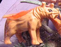 The uintatheres are the earliest known large mammals. The largest of them were between rhino and elephant size. They had six small horns and large upper canines (possibly a case of sexual dimorphism - i.e., the boys had the canines and the girls didn't). There were other peculiarities of the skull and dentition but they're not so prominent as the horns and canines. They also had very small brains. The Ja-Ro figure looks fairly decent, except that I think the hind legs are much too short.