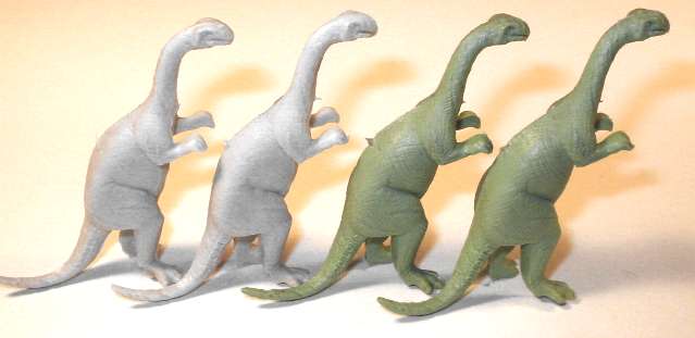 Hmmmm ..... well, maybe. The markings on both Marx Plateosauruses are identical. Plateosaurus markings - PLATEOSAURUS (left side of tail), 20'LONG (right side of tail) Plateosaurus (specifically, Plateosaurus engelhardti Meyer) was identified in 1837. About a hundred skeletons have been found, ranging from fragmentary to complete, and maybe a dozen skulls are known. He was a native of the upper Triassic, which is very early for a dinosaur. Nevertheless he was a formidable beast, averaging some 6.5 meters (21 feet) in length, with some big specimens reaching 9 meters (29 feet). Early notions that Plateosaurus and his close relatives were prosauropods, or ancestors of the sauropods (Apatosaurus, Brachiosaurus, Camarasaurus, Diplodocus, Cetiosaurus, etc) which flowered during the Jurassic, are now in disfavor. Despite his age, Plateosaurus seems too specialized to be a direct ancestor of the sauropods. Despite years of study, the lifestyle of Plateosaurus remains problematical. The usual guess is that he was some sort of vegetarian, based on study of jaws and teeth, but it's not as obvious as it is for some other dinosaurs. And his gait is still conjectural. His forelimbs are not all that well adapted for walking on all fours, but his spinal column isn't all that well adapted for bipedalism. Arguments one way or the other tend to be based on size ratios of various bones, which is all very interesting but not terribly convincing. Zallinger had it both ways in Age of Reptiles - one up, one down. It's odd that Marx made their Plateosaurus so small - he's hardly bigger than the Marx Dimetrodon, even though the biggest Dimetrodon species didn't exceed ten feet in length. And the Marx head is entirely wrong. Plateosaurus had a tall but narrow skull, rather than the blunt lump Marx stuck him with. |