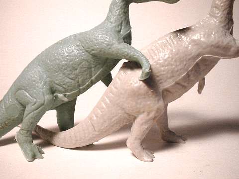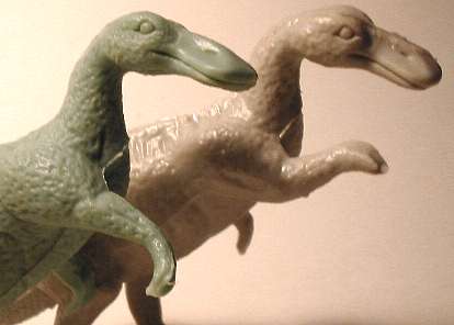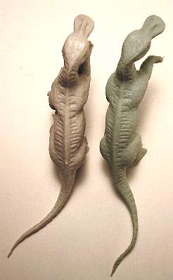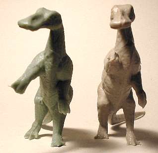 Marx produced two Trachodons. Trachodon (a) was part of the medium mold group, and appeared about 1955. Trachodon (b) was part of the revised mold group, appearing about five years later. Both versions were produced up to about 1964, and were reissued by Marx in the early 1970s. Trachodons (a) and (b) are, at first glance, identical, but there are quite a few differences. The most obvious is the right forepaw. Trachodon (a)'s forepaw is bent downward, and (b)'s is raised.