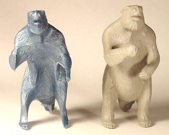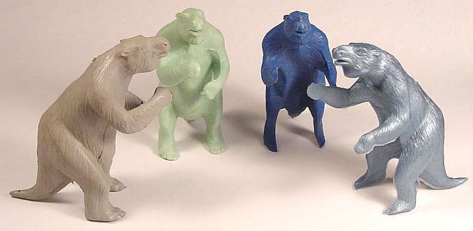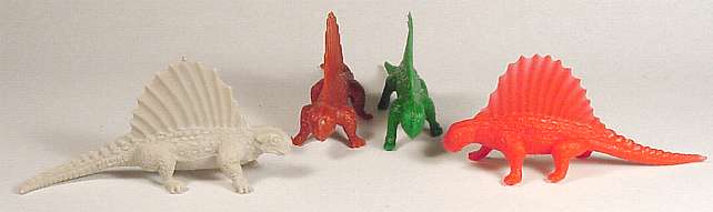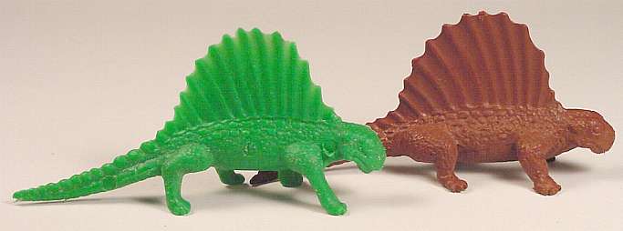 Actually these make an inadvertently cute set, a little Kronosaurus family. However, the life cycle of Kronosaurus is speculative ... and I speculate that K. wasn't big on family life, and that there was never any such thing as a Kronosaurus family group. But no matter. The MPC figure was obviously modeled on the Marx one, subject to the usual deal of converting a figure needing a 3-piece mold to one needing only 2 pieces. But to get the gaping jaw effect, the MPC mold had to be right and left halves (rather than the more obvious option, dorsal and ventral). That in turn means that the flippers had to be offset, just as MPC did to the figures with legs. So the MPC Kronosaurus looks like it's walking rather than swimming -