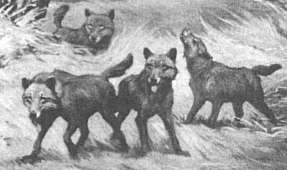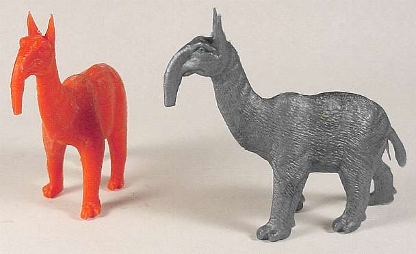 Markings - MACRAUCHENIA, 18' LONG (both on top of back) Like most MPC figures, this was made in a 2-piece mold. The Dire Wolf has a perfectly good Linnaean name, Canis dirus, but MPC opted to not use it. This would be a useful figure for, say, a Rancho La Brea play set, as the tar pits are full of these wolves, although C. dirus looked much like a modern wolf and figures of such could obviously be substituted. The indispensable Charles R. Knight left us a picture in one of his murals at the American Museum of Natural History in New York -