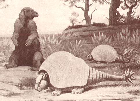 UPDATE - My current theory - that two of the primary visual sources for the Marx and MPC figures were the Zallinger Age of Reptiles mural and the smaller Life version of the Age of Mammals - implies that the MPC glyptodont was patterned after a painting of Boreostracon, rather than Doedicurus. Here is the extreme lower-right of the Age of Mammals, as published in Life in 1953 -