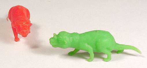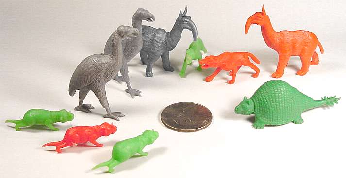 These are pretty decent figures ... too bad MPC didn't make more like them. Alert readers have doubtless already noted that none of these are dinos. We have four representatives of class Mammalia and one of class Aves, but they'll just have to do. Ceratogaulus, a Miocene native, was, oddly enough, a horned rodent. Only my older references mention him. Henry Osborn tells us, in The Age of Mammals (1910), " . . . there has been discovered the extraordinary Ceratogaulus rhinocerus, which has a special horn-bearing bone on the nasals, which was undoubtedly capped with a prominent pointed dermal horn." And Karl von Zittel (Grundzüge der Paläontologie Vol. III, revised 1916, further revised 1925) notes "Ceratogaulus Matthew (with bony horn-core on the nasals)" as a member of the subfamily Mylagaulinae, which have extremities apparently adapted for digging. The most recent mention in my library is in Romer (Vertebrate Paleontology, 3rd edition, 1966) which tells us only that Ceratogaulus is found in the Upper Miocene of North America. The MPC figure was made in a 2-piece mold, and in the usual inappropriate MPC colors.