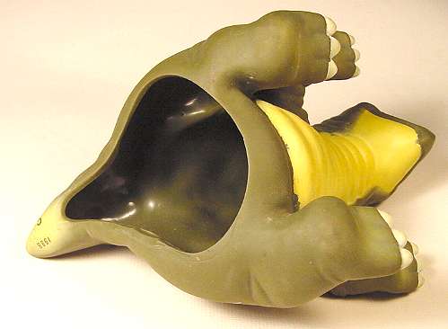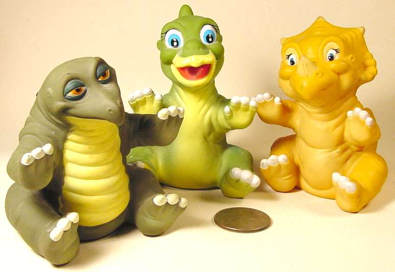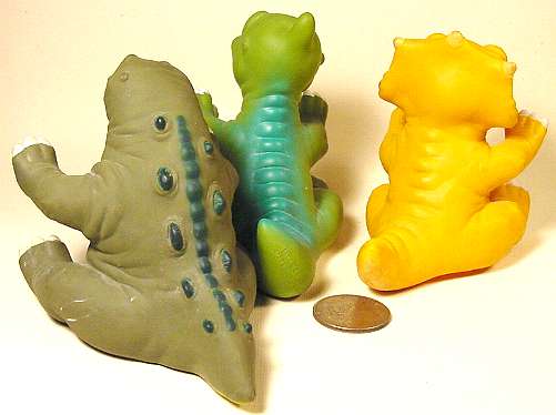 These were donated to the Rubber Dino Museum by a person who wishes to remain anonymous, and to that end bound me to a cataclysmic oath of secrecy. I can't see why, actually. Inexplicable as these things are, they're not really all that bad. The story is that they were Pizza Hut premiums in the late 1980s, and there were four in the series, though my benefactor didn't eat enough pizza in those days to get them all. They must have been some sort of TV tie-in. They are made of blow-molded rubber. Construction and finish quality are exceptional. UPDATE March 31, 2003 - Alert reader CZaphodB42 notes that these figures "seem to be from the animated movie The Land Before Time." (Hmmm .... I must have missed that one ....)