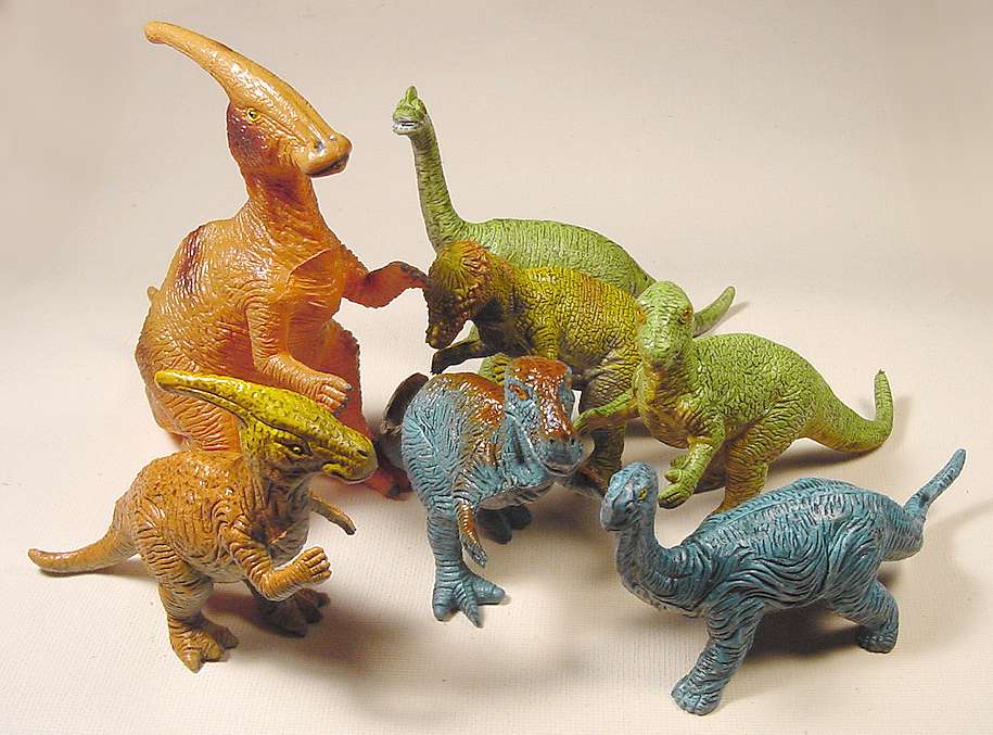 Here are some vinyl Chinasaurs I found in Germany. These had attached tags from Simba Toys GmbH & Co. of Fürth (in Bavaria, very close to Nürnberg). The figures themselves have no Simba markings. They bear 1990s copyright dates and "U.K.R.D." Other markings are the standard CE compliance symbol, a UKRD part number, the name of the animal, and "Made in China." Simba has a web site (actually several, all identical except for URL). However, as of December 2002 it is remarkably uninformative, a mere single page with a photo of generic kinder and an e-mail address. The figures I have are clearly from two different series, one large (~ 6" figures), the other smaller (~ 4"). The Simba tags assign them to two series, Dinosaurier Collection and Little Dino-Land. According to the tags, the two series consist of -